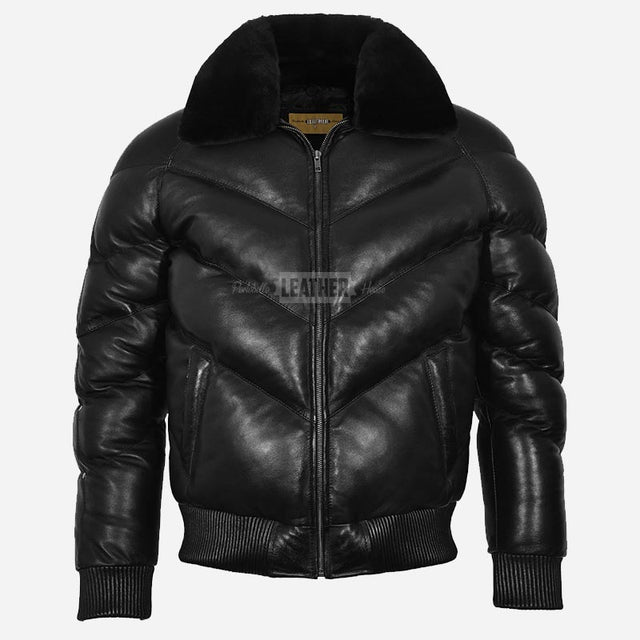 STRAVOX Men's V-Bomber Puffer Leather Jacket